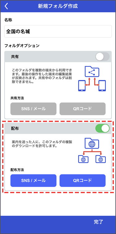 フォルダの名称を入力し、「完了」ボタンを押すと、新規フォルダが作成されます。